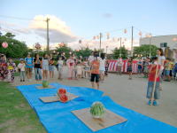 | 主催:五町内自治会 協賛:子供会他各種団体・消防団(会場設営) 日時:平成22年8月7日(土) 18時30分〜 場所:田迎2丁目公園(田迎神社前) 恒例の田迎夏祭り五町内「納涼盆踊り大会」が平成22年8月7日に田迎2町内公園において開催 されました。 祭りの前日には、JA農協婦人部や子供会の皆さんが田迎公民館において踊りの練習に精をだしま した。祭り当日は、昼間は猛暑であったにも拘わらず、夕方からなんとなく涼しい風が吹き、浴衣姿で いっぱいとなった会場は清々しい雰囲気につつまれました。 勇壮な田迎太鼓の演奏から始まった会場では、子ども達による「スイカ割り大会」では、「スイカの香 り」を夏の思い出として楽しんでいました。 続いての総踊りでは、「おてもやん、ごちそう讃(さん)、ポケモン音頭、きよしのズンドコ、サンバおて もやん、炭坑節」と踊りの「輪(和)」は広がり、楽しい盆踊りとなりました。人気の「福引き」では 心わく わく、このように夏の夜のひとときを楽しくすごしました。 今年も地域の皆さんのおかげで、心かよう祭りができたことに感謝します。