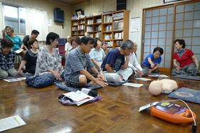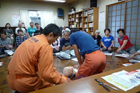 | て来たことやAEDの使い方の説明に真剣に耳を傾け質問されていました。 |