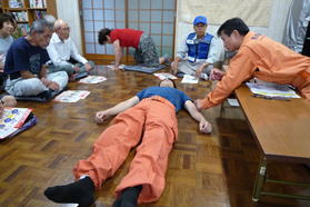 | の後人形を使って人命救助の訓練に移りました。胸骨圧迫(心臓マッサージ)は1分間 |