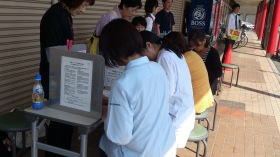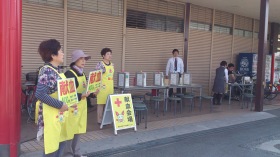 | イワサキエース前で献血運動をしました。田迎・田迎西女性の会合同活動です。 近くの病院、ケアセンター職員の方々、地域の方々に協力いただきました。 |