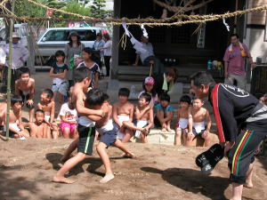 | 田迎神社奉納子ども宮相撲大会 9月5日(土)に「子ども宮相撲大会」が田迎神社にて開催されました。 天気もよく心地よい風が吹く中、まず 「赤ちゃん相撲」 から始まり、13人の元気な 赤ちゃんが、5・6年生のお兄ちゃん達に抱かれ、いつもと違う抱き心地に「ためら いながら ? 」のかわいい土俵入りとなりました。 小学生の部では、男の子も女の子もみんな迫力のある取り組みで、見応え十分 でした。 その後、学年関係なしの「勝ち抜き戦」が行われましたが、今年は6年生の兵頭君 の見事な攻め相撲で、対戦相手はみんな土俵の外に投げ出されました。強かった! みんな一生懸命に相撲をとっていたので、見ていてとってもすがすがしい気分にな りました。 ![]() |