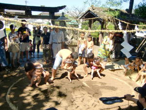 | 田迎神社奉納子ども宮相撲大会 晴天に恵まれた平成22年9月4日、田迎神社奉納子ども宮相撲大会を1・5町内 で行いました。 当日は残暑厳しい中にもかかわらず、早朝から宮総代の方々、消防団の方々をは じめ自治会の皆さんに御協力いただき、開催することができました。 境内にわずか1時間程で立派な土俵が出来上がっていくのには驚きました。 その立派な土俵の上で、最初は赤ちゃん相撲を行いました。 1・5町内に住む1歳未満の赤ちゃんを募り、今年は9名の参加がありました。 お母さんと離れて泣いてしまう赤ちゃんもいれば堂々とした表情の赤ちゃんもいて、 会場をとても和ませてくれました。 その後、就学前と小学生の子ども達の取組でした。 子ども達は生き生きとした表情で一生懸命頑張っていました。 子ども同士の対戦では、どうしても押し出しで勝敗が決まることが多いのですが、 時々違う決まり手が出ると、観客の皆さんの歓声も一際大きくなっていました。 5人抜きの部では、3年生の高本大智くんが優勝しました。 この宮相撲大会は、田迎地区に何十年も続いている行事だそうです。 核家族化が進んだ現在でも毎年開催できるのは、地域の皆さんの協力のお陰だと 改めて感じました。 子ども達にとっても、土や縄の感触を裸足で感じる、また友達とお互い体をぶつけ 合って遊ぶ機会はなかなかありませんので、良い経験になったと思います。 (5町内子ども会長 緒續美智子) ![]() |