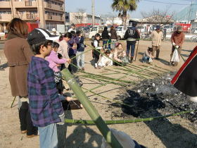 | 1月12日(土)、名の内公園にて1・5町内の「どんどや」が行われました。 今年は年明けから例年にない寒い日が続いていましたが、当日は朝から青い空が 広がり暖かい日差しが降り注ぐ絶好のどんどや日和となりました。 午前7時半に消防団の皆さんが竹の切り出しに出発。8時半頃から自治会の 方々や各役員の皆さんが公園の準備を開始。 事前に準備された餅焼き用の竹は手際よく整えられ針金を取り付けて下さいま した。テント、テーブル、イス等が会場に持ち込まれ準備ができた頃、竹を積ん だトラックが到着。 沢山の竹はみるみるうちに組み立てられ、約10メートルの立派なやぐらが完 成しました。 米村自治会長のご挨拶の後、10時過ぎに小学生2人により点火。 火は白煙を上げて燃え上がりやがて「パーン」という音が響き渡ると、集まった 多くの人達が歓声を上げると共に今年の無病息災を祈願していました。 その後テントでは子ども会が準備したぜんざいが振舞われ、燠き火の方では 子ども達が真っ赤な顔をして楽しそうにお餅を焼き、それぞれに喜んでいただき ました。 今年も自治会、消防団を始め多くの方のご協力により、無事に「どんどや」を 行うことができました。 私達は今後も、多くの人々が絆を深め、又 子ども達が 楽しみにしているこの伝統行事を末永く引き継がなければと思います。 (1町内子ども会 会長 米満早苗 )