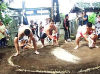 | 田迎神社境内で田迎西校区第1・第2・第3町内子ども会合同による相撲大会が 健康祈願と健やかな成長を願って熱戦がくりひろげられた。 乳幼児の土俵入りに始まり幼児・小学校1年生から6年生の相撲が行われた。 ![]() |