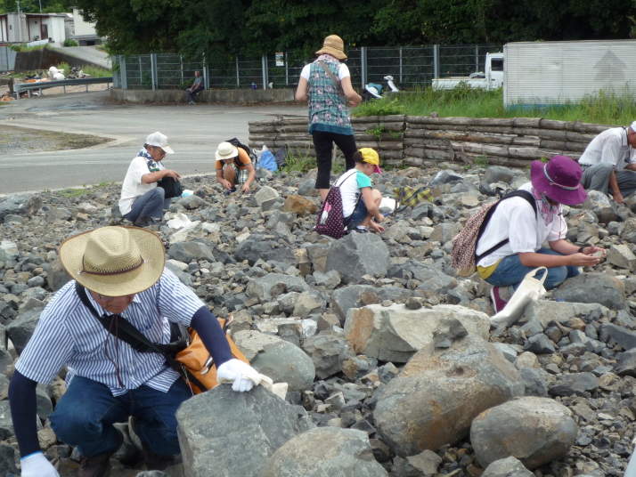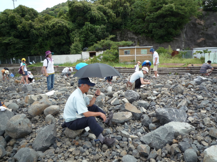 昼食後、花岡山化石採集場でハンマー片手に汗を流しながら約9800