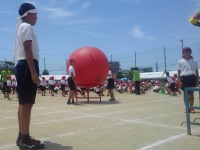 | 5月27日(日)快晴の空の下、大いに盛り上がった一日でした。 逆転に次ぐ逆転の中、全員による「大玉ころころ」が運命を分けて、1,400点対1,388点今年は赤団の勝ち! |