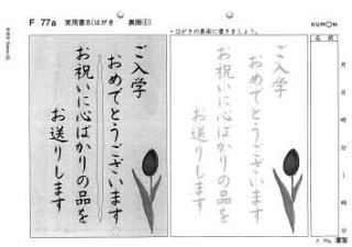 | 活 動 内 容 | 毎週金曜日午後3時から、好きな時間に来て自由に学習出来ます。 (30分〜1時間程度) 公文書写教室では、美しい文字が書けるテキストがあり、そのテキストをもとに 自分に合ったスピードで学習出来ます。 |