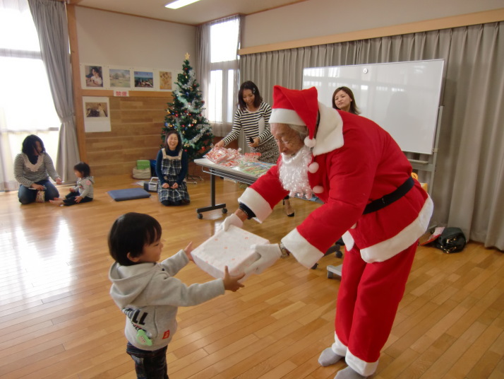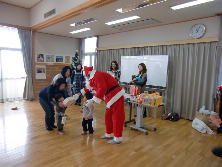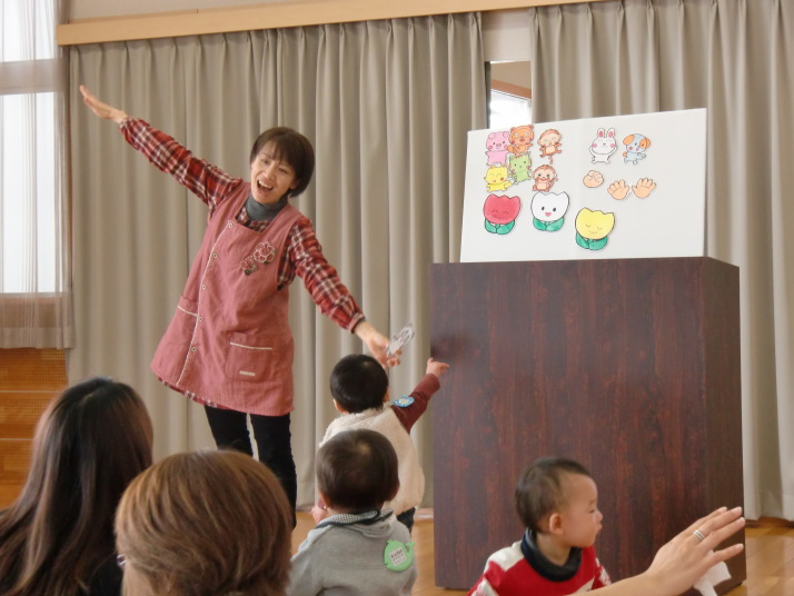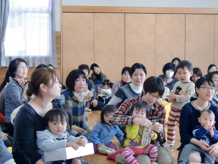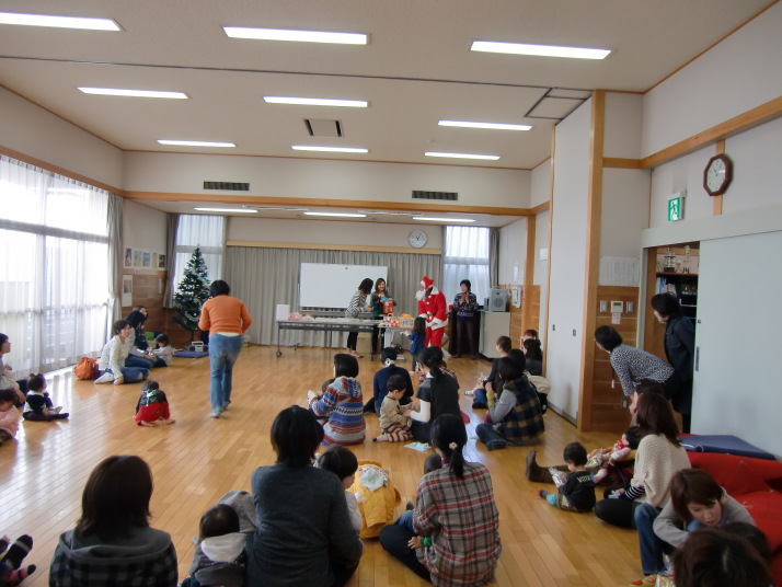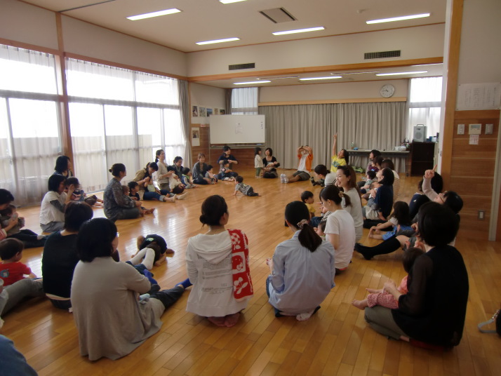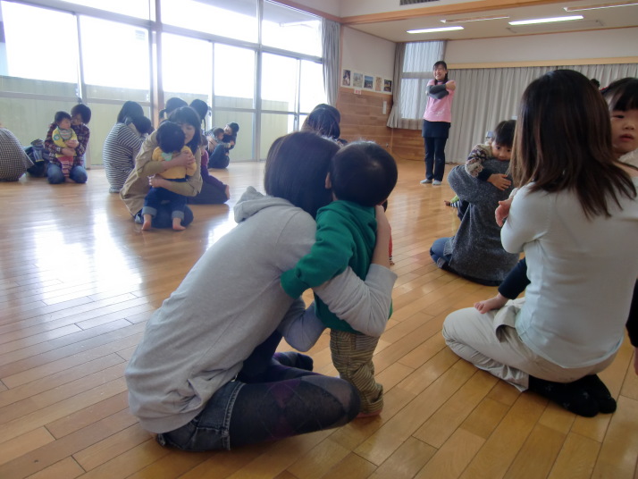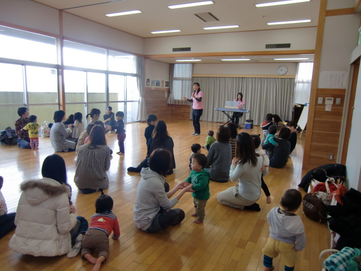 本日はワイワイランドから先生2人に来て頂いてリトミックを行いました。 音楽に合わせて親子で沢山体を動かしました。最後には楽器の演奏を皆で行い楽しみました。 今日は、田迎校区のいきいきクラブの高齢者のみなさんと交流会を行いました。 音楽に合わせて体を動かした後に民生委員とボランティアの方達が作ってくださっただご汁と おにぎりをみんなでおいしくいただきました。 今月はクリスマス会を行いました。 リズム遊びを行った後、サンタさんからお菓子を一人一人手渡しでもらってみんな大喜びでした。 その後の抽選会では、いろいろなおもちゃが当たり、クリスマス気分を存分に味わえたと思います。 メゾンどキタガワの北川博喜先生に来て頂いて、クレープ作りを行いました。 子ども達をあずけて、親同士いろいろと会話をしながらゆっくり作ることができました。 フルーツ入りのクレープでとてもおいしかったです。 今日は、ふりーだむEnglish Schoolから先生方2人に来ていただき、英語にふれ合いながら 楽しく体を動かしました。 体を動かしながら英語を口ずさむ子どももいて、楽しい英語体験になりました。 今回はみなみYMCAのご協力のもと、親子スイミングを行いました。 浅いプールで水遊びをして水に慣れてから、深いプールでトンネルをくぐったりなど、楽しい時間を 過ごすことが出来ました。 <入った方の感想> 「初めてのプールにもかかわらず笑って入っていました。」 「子どもが意外と怖がらずに、喜んで入って良かったです。」 今日は、桜田幸子先生による講演会でした。子育ての中での楽しいお話や、母乳育児の悩みなど、 いろんなお話しを聞くことができました。 今日は、九州OKJインストラクター富田裕美先生による親子ビクスを行いました。 子ども達も楽しみながら、親もストレッチなど体を動かすことができ、楽しい時間を過ごせました。 熊本市消防局の救急隊員の方々が来てくださり、熱中症の予防法や人形を使っての心肺蘇生法 等、小児の救急時の対処方法についてのお話しをしてくださいました。 今月は南保健福祉センターの歯科衛生士の方を講師に迎え、ブラッシング指導をしていただき ました。 歯についての紙しばいを読んでいただいたり、実際に子ども達の歯をみがいてもらい、アドバイス をいただきました。 ![]() |