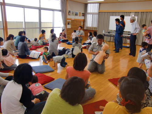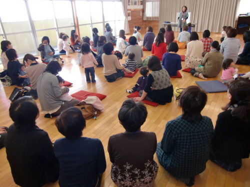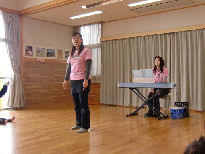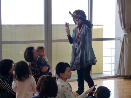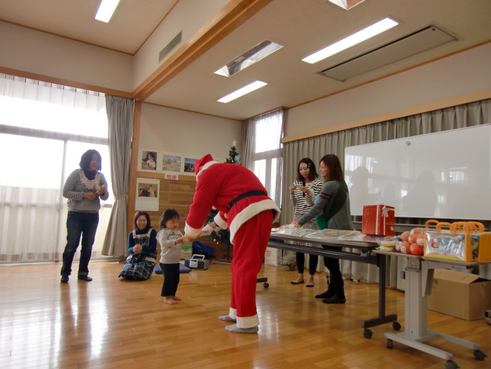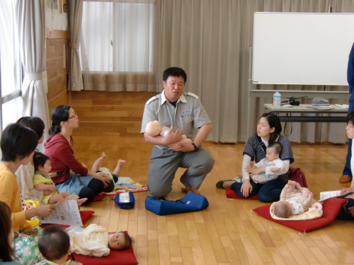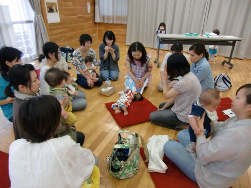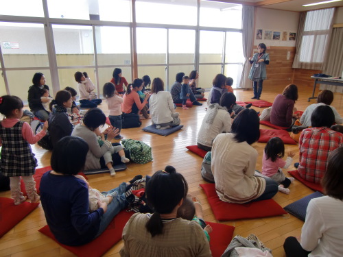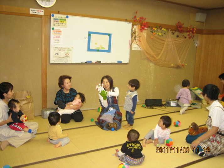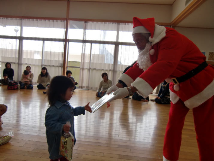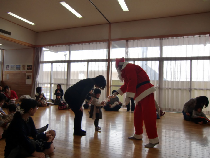 本日はワイワイランドから先生2人に来て頂いてリトミックを行いました。 音楽に合わせて親子で沢山体を動かしました。最後には楽器の演奏を皆で行い楽しみました。 今日は、田迎校区のいきいきクラブの高齢者のみなさんと交流会を行いました。 音楽に合わせて体を動かした後に民生委員とボランティアの方達が作ってくださっただご汁と おにぎりをみんなでおいしくいただきました。 今月はクリスマス会を行いました。 リズム遊びを行った後、サンタさんからお菓子を一人一人手渡しでもらってみんな大喜びでした。 その後の抽選会では、いろいろなおもちゃが当たり、クリスマス気分を存分に味わえたと思います。 メゾンどキタガワの北川博喜先生に来て頂いて、クレープ作りを行いました。 子ども達をあずけて、親同士いろいろと会話をしながらゆっくり作ることができました。 フルーツ入りのクレープでとてもおいしかったです。 今日は、ふりーだむEnglish Schoolから先生方2人に来ていただき、英語にふれ合いながら 楽しく体を動かしました。 体を動かしながら英語を口ずさむ子どももいて、楽しい英語体験になりました。 今回はみなみYMCAのご協力のもと、親子スイミングを行いました。 浅いプールで水遊びをして水に慣れてから、深いプールでトンネルをくぐったりなど、楽しい時間を 過ごすことが出来ました。 <入った方の感想> 「初めてのプールにもかかわらず笑って入っていました。」 「子どもが意外と怖がらずに、喜んで入って良かったです。」 今日は、桜田幸子先生による講演会でした。子育ての中での楽しいお話や、母乳育児の悩みなど、 いろんなお話しを聞くことができました。 今日は、九州OKJインストラクター富田裕美先生による親子ビクスを行いました。 子ども達も楽しみながら、親もストレッチなど体を動かすことができ、楽しい時間を過ごせました。 熊本市消防局の救急隊員の方々が来てくださり、熱中症の予防法や人形を使っての心肺蘇生法 等、小児の救急時の対処方法についてのお話しをしてくださいました。 今月は南保健福祉センターの歯科衛生士の方を講師に迎え、ブラッシング指導をしていただき ました。 歯についての紙しばいを読んでいただいたり、実際に子ども達の歯をみがいてもらい、アドバイス をいただきました。 ![]() |