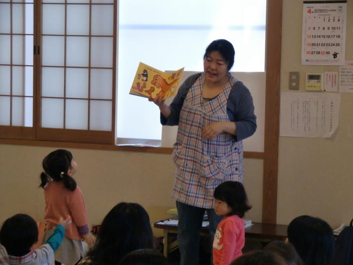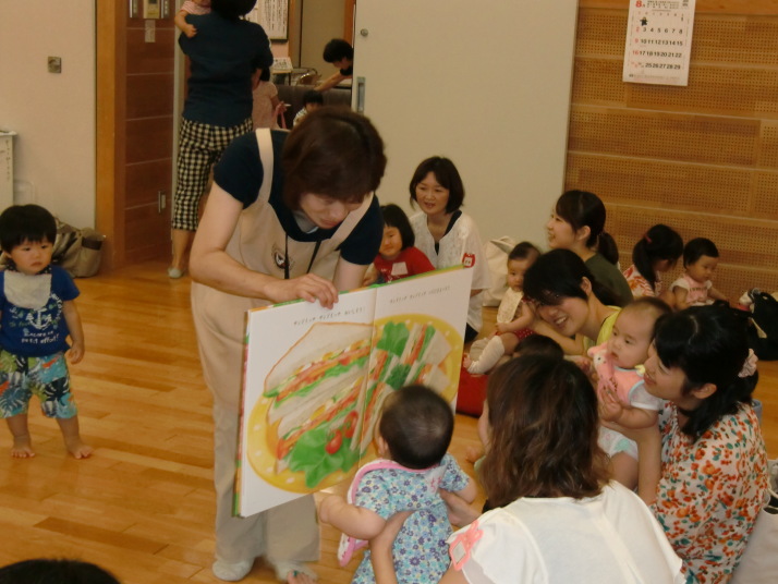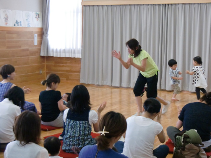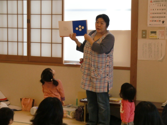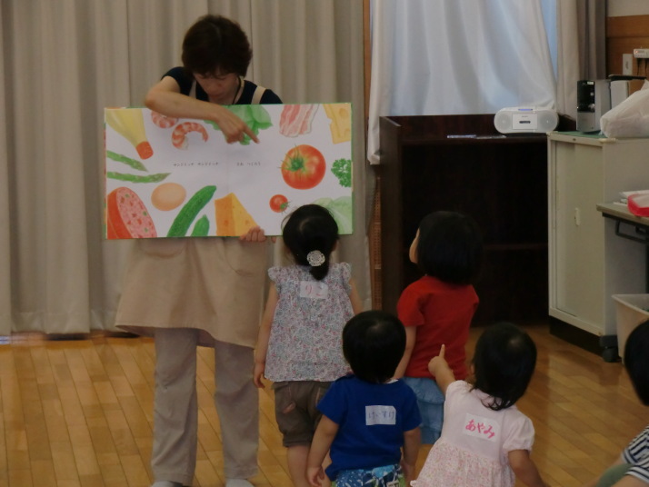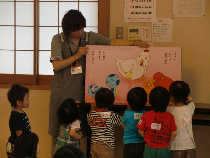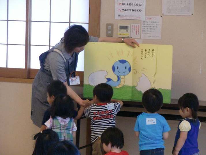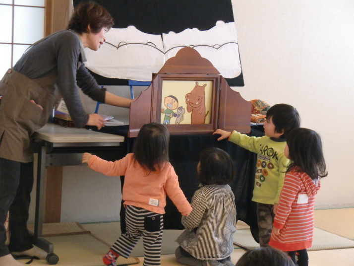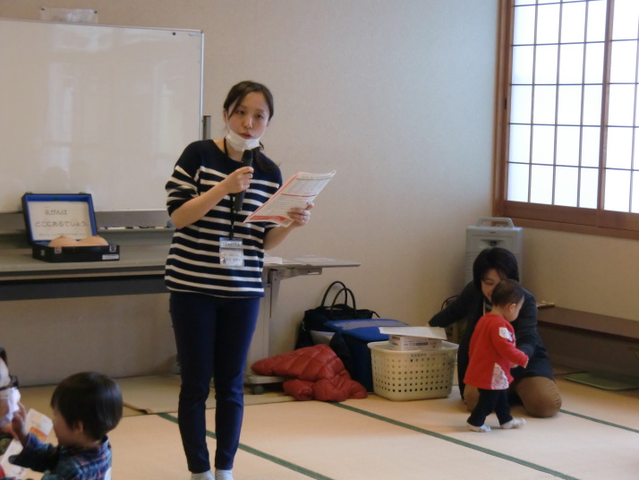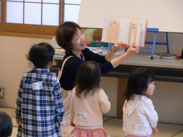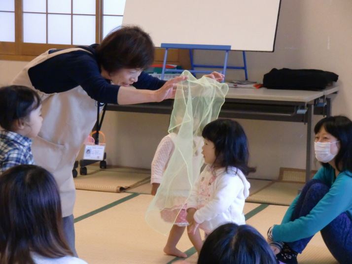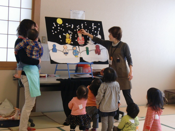 今回は、布絵本・パネルシアター・紙芝居・手遊び等をしました。エプロンから出てくるマスコットに