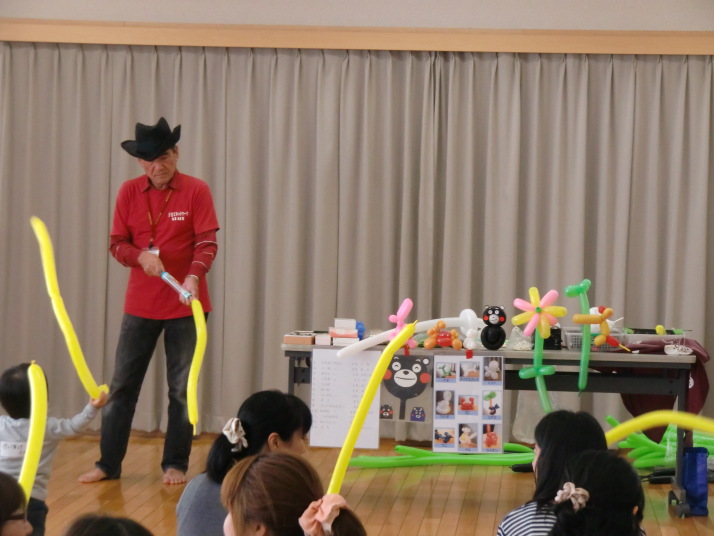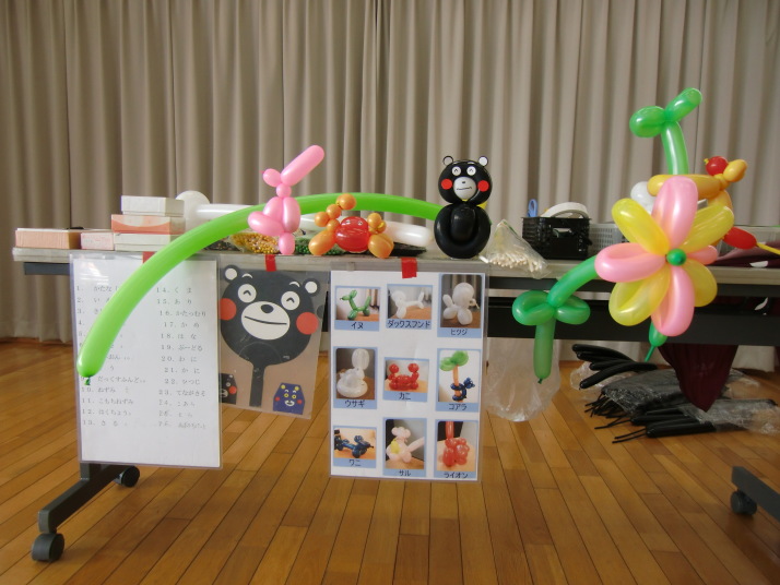 今日は、バルーンアートをして楽しみました。かわいいお花にみんなが大好きなくまモンを作りました。