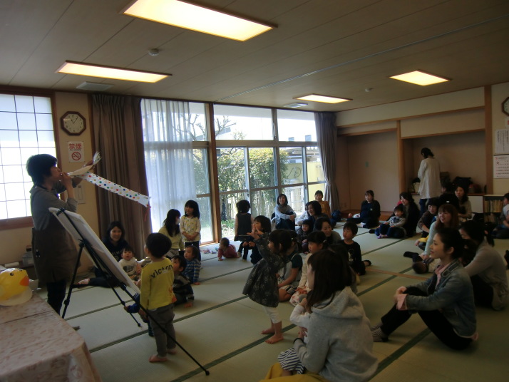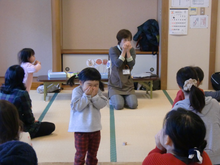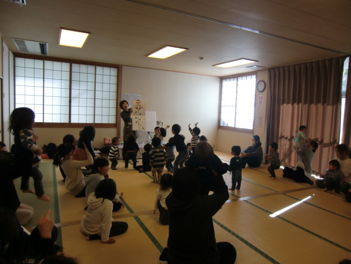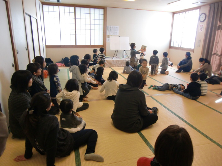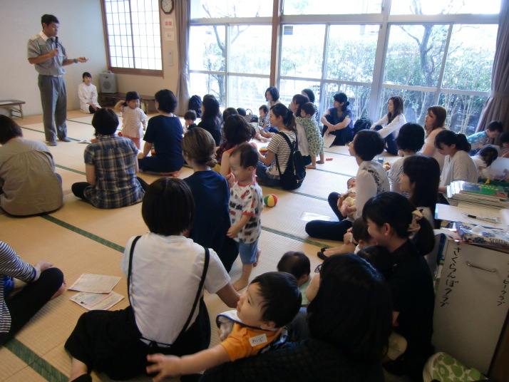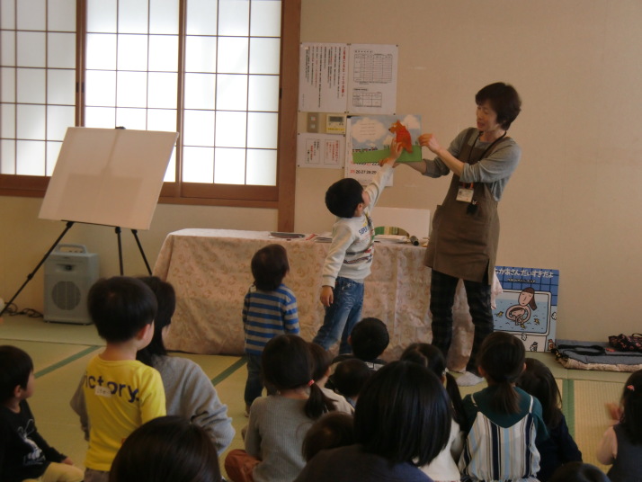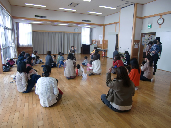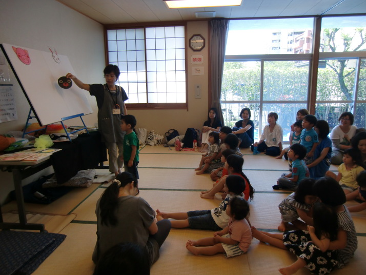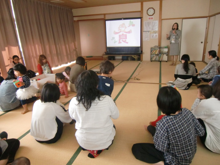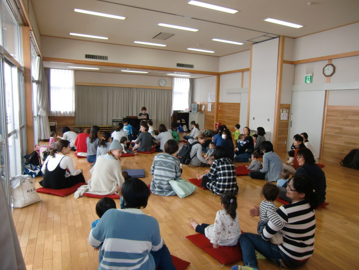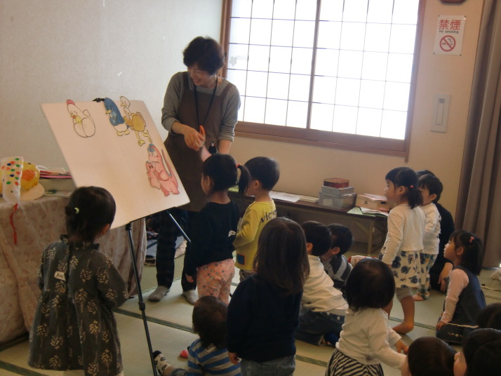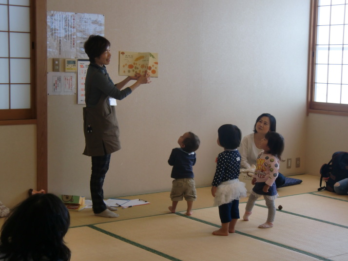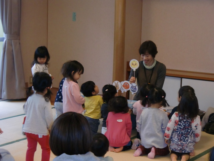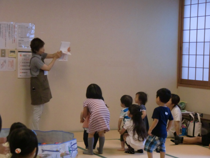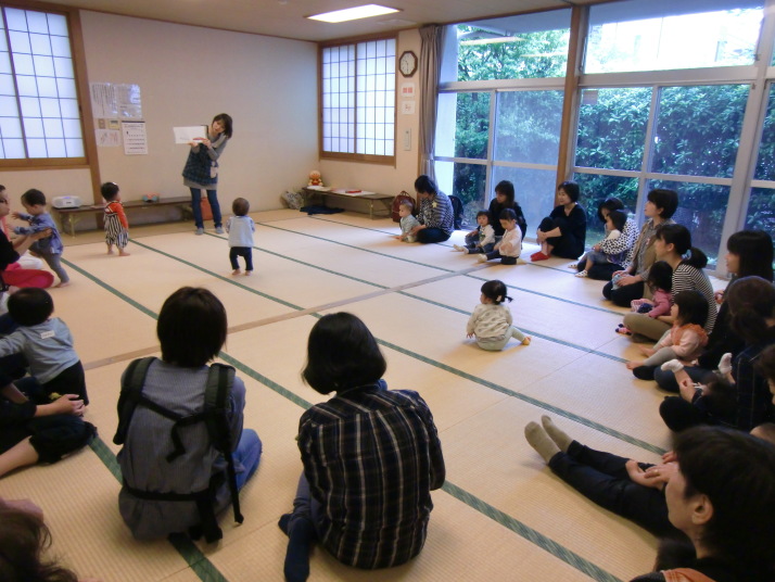 紙芝居や絵本の読み聞かせを聞いたり、手遊びをしたり、みんなで自己紹介を
