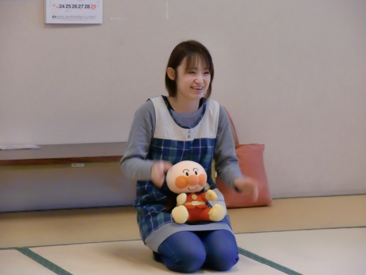 幸田子育て支援センターの先生に絵本の読み聞かせやアンパンマンの手遊び歌を