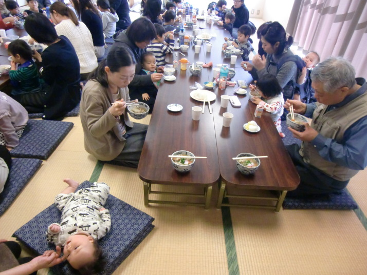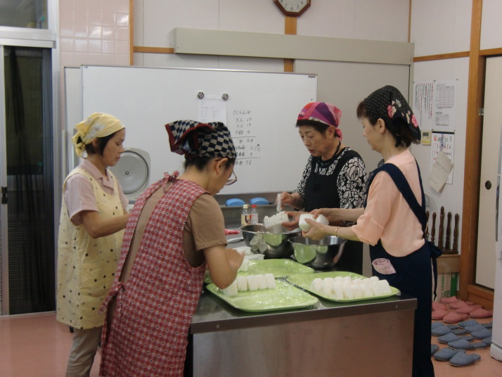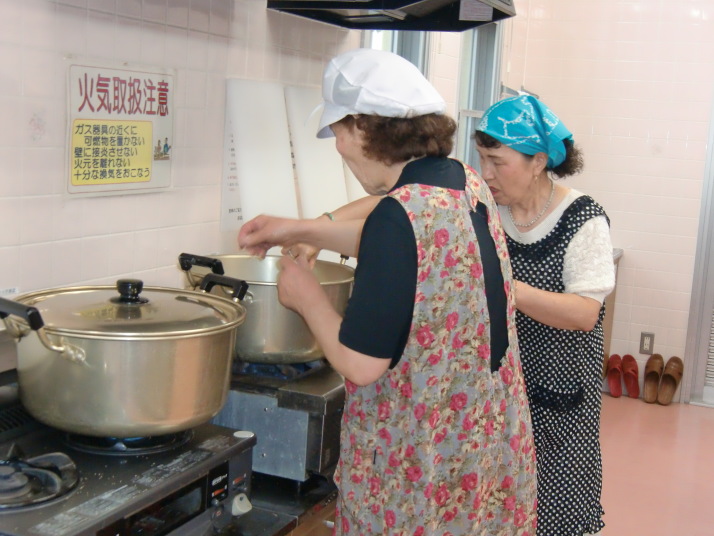 お話し会の後は、女性の会や民生委員の方々にだご汁とおにぎりを作って頂き、