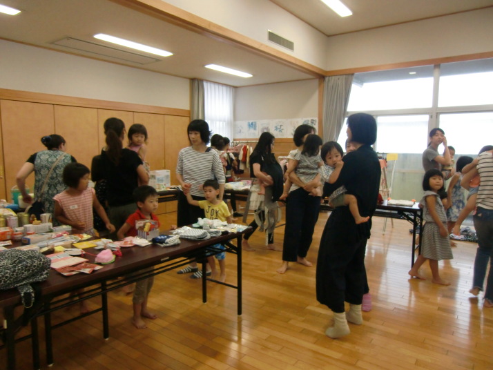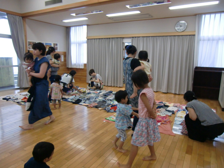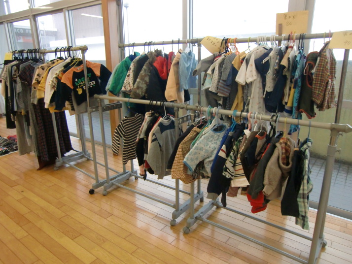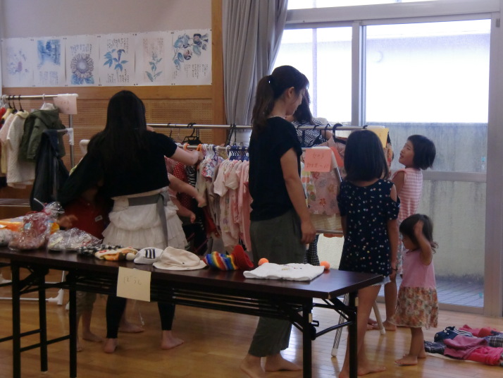 今日のフリーマーケットは、子ども用の洋服がたくさん出品され、物々交換も
