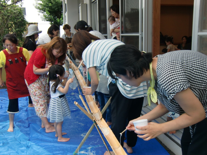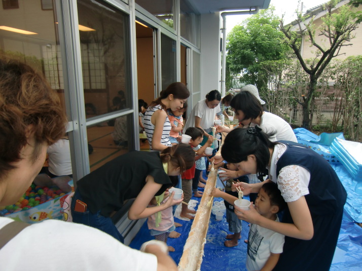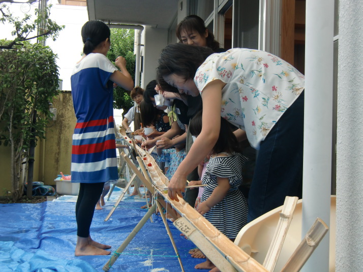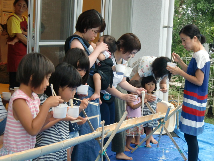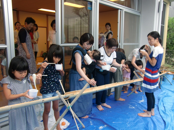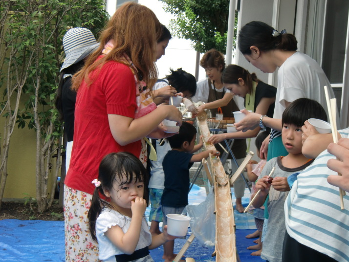 本物の竹から流れてくるそうめんに子ども達は歓喜の声をあげ、楽しみながら
