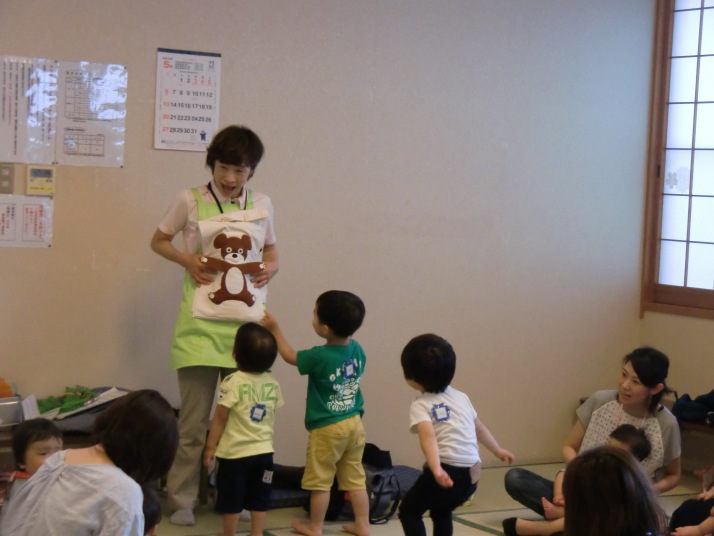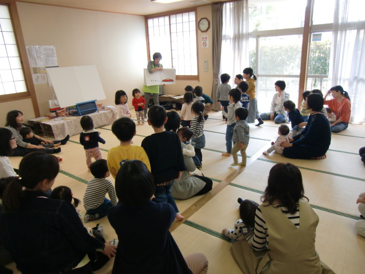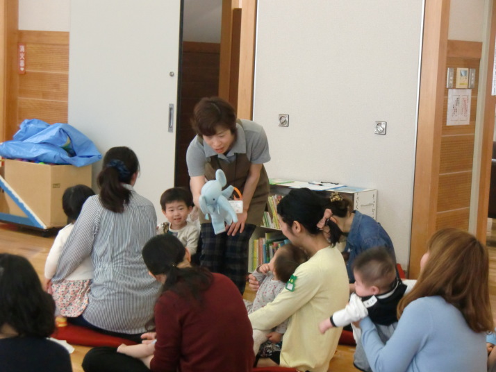 今日のさくらんぼクラブは、絵本やペープサート、ママと一緒のお遊びで子ども達もとても楽しんでいました。