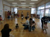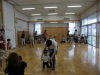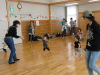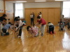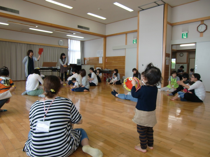 その後、リトミックで音楽に合わせて子どもと一緒に体を動かしたり、楽器を使って遊んだりと