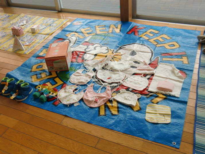 皆で持ち寄りフリーマーケットをしました。洋服、おもちゃ、食品、日用品とたくさんの物を